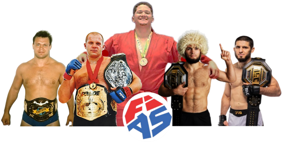 Astros do SAMBO: da esquerda para a direita, Oleg Taktarov, Fedor Emelianenko, Vinicius Abreu, Khabib Nurmagomedov e Islam Makhachev.